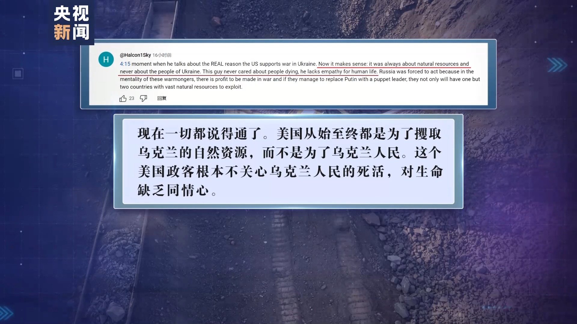 網(wǎng)友:現(xiàn)在一切都說得通了。美國從始至終都是為了攫取烏克蘭的自然資源,而不是為了烏克蘭人民。這個美國政客根本不關(guān)心烏克蘭人民的死活,對生命缺乏同情心。