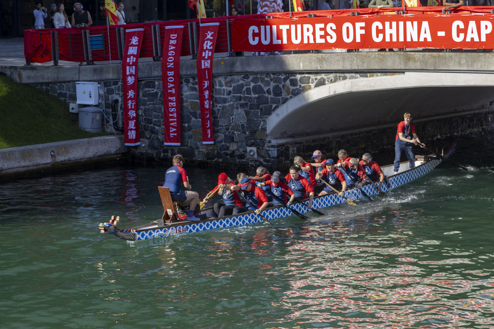 6月8日,人們?cè)谀戏情_普敦參加第二屆“文化中國(guó)·開普敦龍舟節(jié)”比賽。新華社記者王雷攝