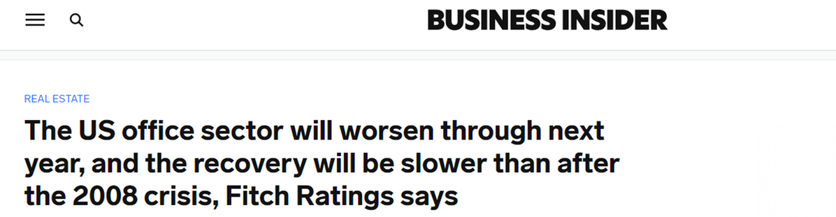 惠譽稱:“與2008年全球金融危機之后相比,此輪周期中寫字樓行業(yè)的復(fù)蘇將更加緩慢、耗時,并將導(dǎo)致美國房地產(chǎn)價值永久性受損、業(yè)績表現(xiàn)疲軟以及貸款損失增加?!?/p>