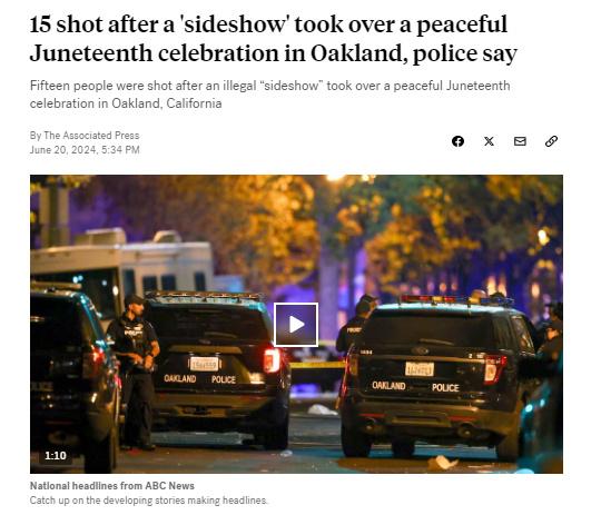 據報道,奧克蘭警方表示,槍擊事件發(fā)生在該市舉行的一場未經批準的六月節(jié)慶祝活動期間。有人踩上一輛汽車引擎蓋引發(fā)斗毆,進而發(fā)生槍擊事件。