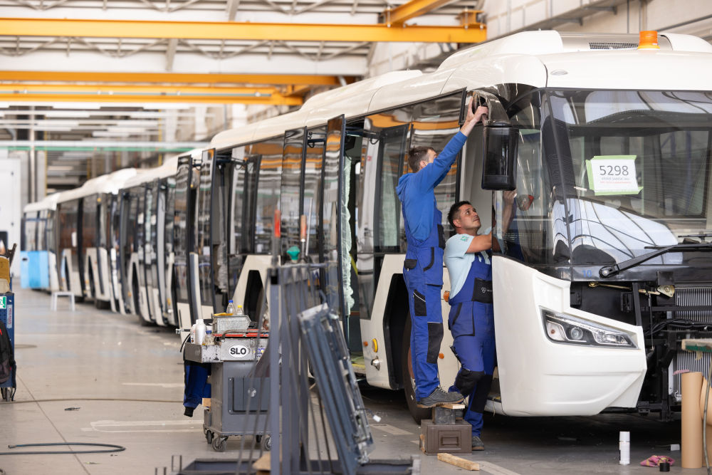 6月14日,在斯洛文尼亞馬里博爾郊區(qū)的TAM歐洲商用車(chē)研發(fā)制造公司工廠,工人在電動(dòng)巴士生產(chǎn)線上工作。新華社發(fā)(澤利科·斯特凡尼奇攝)