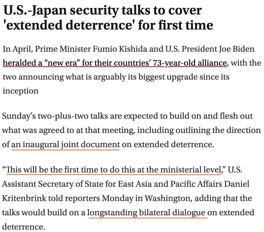 根據(jù)美國負(fù)責(zé)東亞和太平洋事務(wù)的助理國務(wù)卿克里滕布林克的介紹,這將是雙方長期以來就“延伸威懾”問題舉行雙邊對(duì)話后的第一次部長級(jí)會(huì)談。