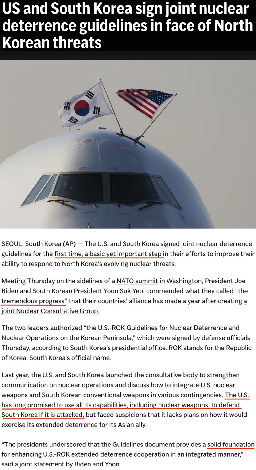 本月11日,在北約華盛頓峰會(huì)間隙,美韓兩國國防部官員簽署《美韓關(guān)于朝鮮半島核威懾與核作戰(zhàn)的指導(dǎo)方針》。這也是兩國首次簽署此類文件,被認(rèn)為是“兩國努力提高應(yīng)對(duì)朝鮮核威脅能力的基本且重要的一步”。