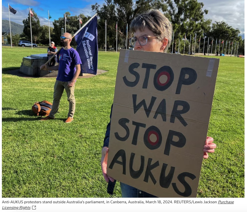 △反 AUKUS 人士在澳大利亞議會(huì)外舉行抗議(圖自路透社)