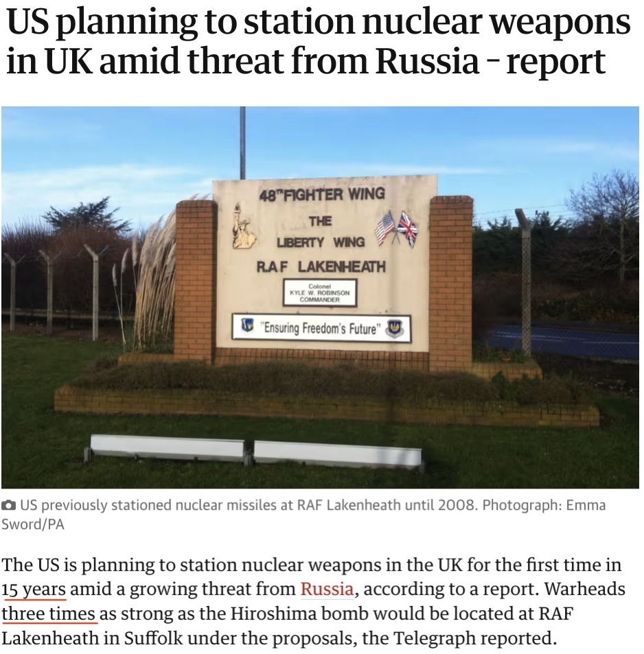 △英國《衛(wèi)報(bào)》:英國薩??丝だ舷K蓟始铱哲娀匦略O(shè)施的采購合同證實(shí),美國打算在該空軍基地部署三倍于轟炸廣島原子彈威力的核彈頭。