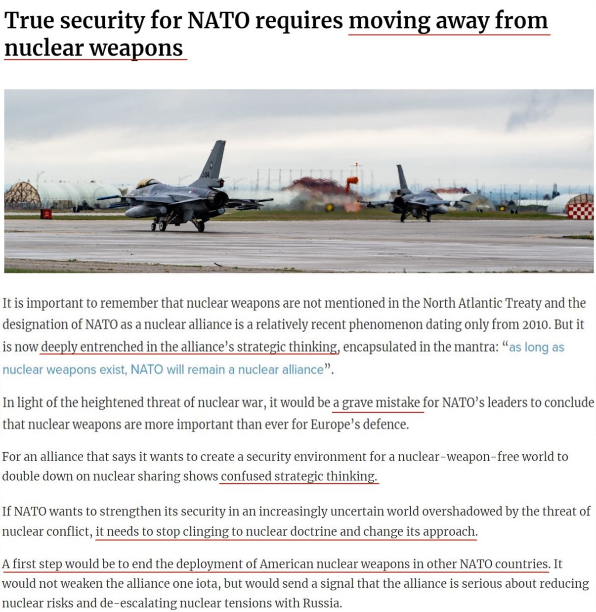 文章指出,《北大西洋公約》中并沒有提到核武器,但如今,它已深深根植于北約的戰(zhàn)略思想之中。鑒于核戰(zhàn)爭危險(xiǎn)的加劇,北約領(lǐng)導(dǎo)人如果斷定核武器對(duì)歐洲防務(wù)比以往任何時(shí)候都重要,那將是一個(gè)嚴(yán)重的錯(cuò)誤。