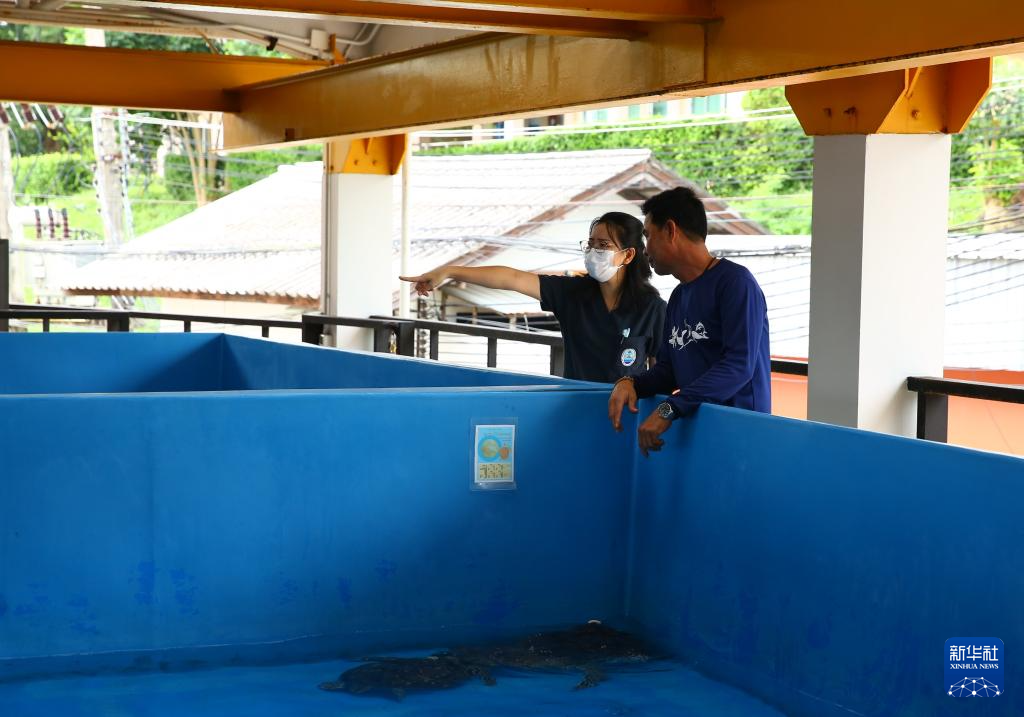 7月23日,在泰國(guó)普吉海洋生物中心,工作人員站在被救助的海龜旁。新華社記者 孫瑋彤 攝