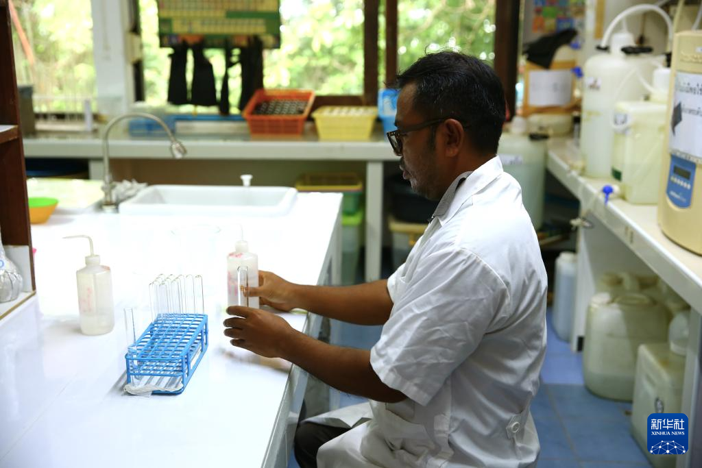 7月23日,在位于泰國(guó)普吉的中泰氣候與海洋生態(tài)系統(tǒng)聯(lián)合實(shí)驗(yàn)室,工作人員進(jìn)行水質(zhì)檢測(cè)。新華社記者 孫瑋彤 攝
