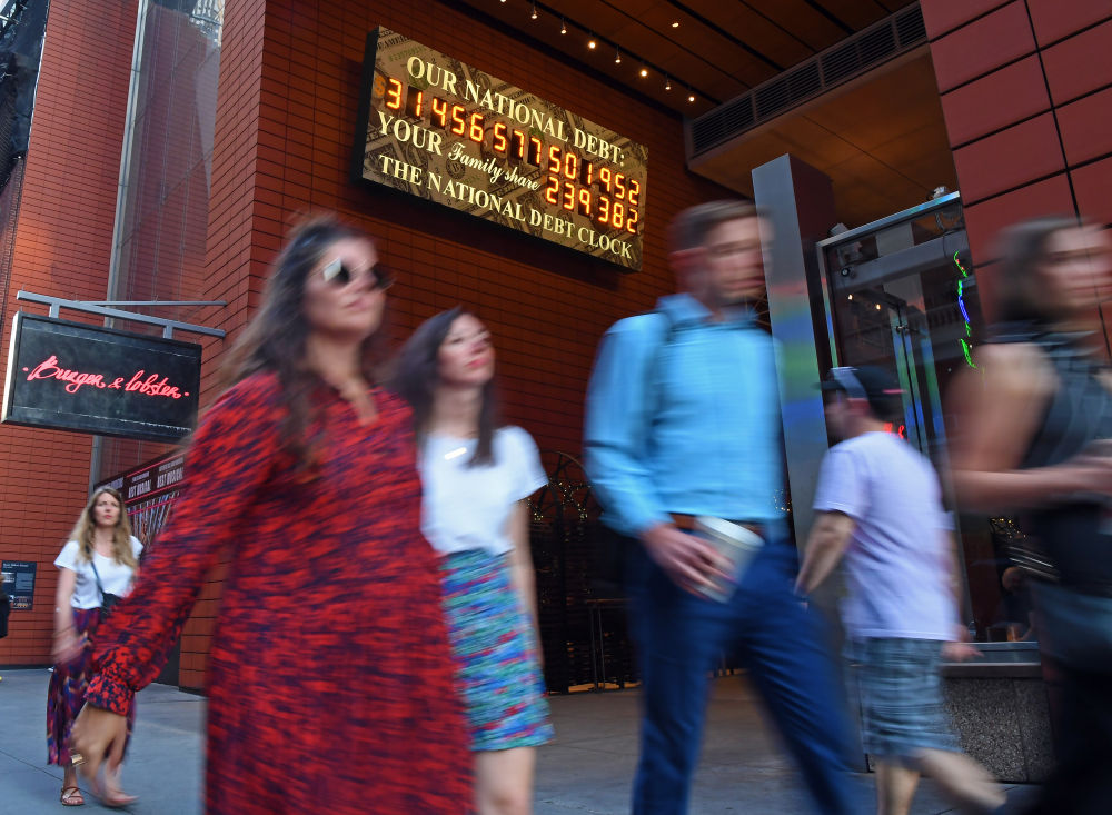2023年6月1日,行人從美國(guó)紐約的“國(guó)債鐘”前走過(guò)。新華社記者李睿攝