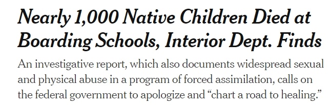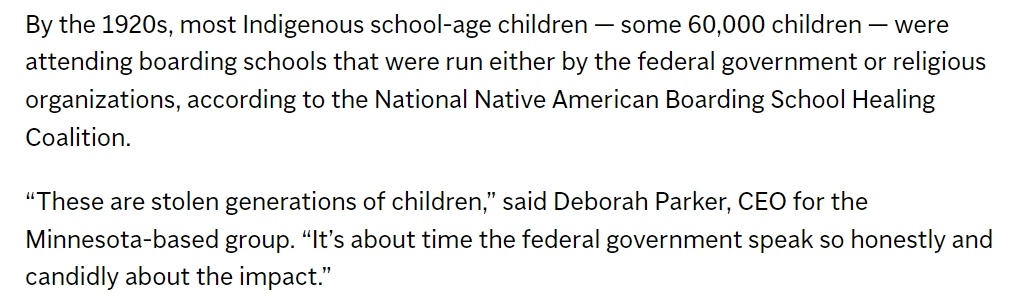 美國首位原住民出身的內(nèi)政部長德布·哈蘭也說,她自己的祖父母在8歲時被“從父母、文化和社區(qū)中偷走”,被迫住在一所天主教寄宿學(xué)校,直到13歲。還有一些被偷到寄宿學(xué)校的孩子年僅4歲。