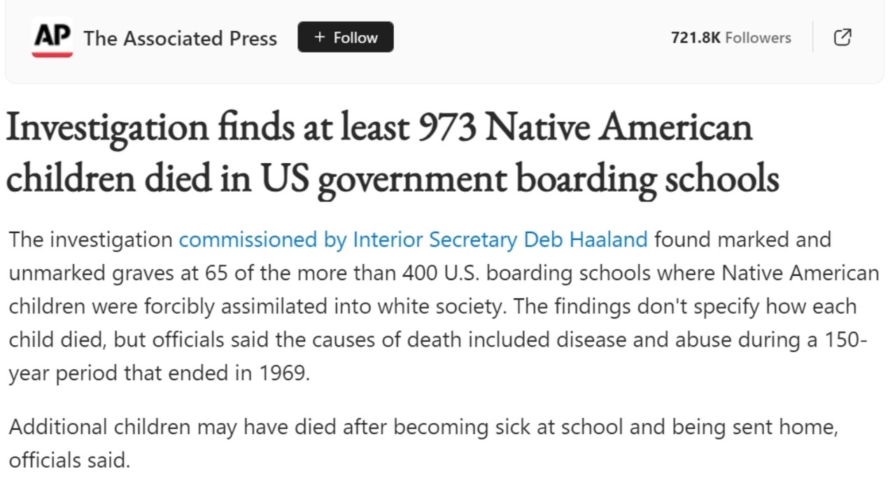 雖然最新公布的報告很不完整,但它再次揭開了美國印第安寄宿學(xué)校的原罪瘡疤。