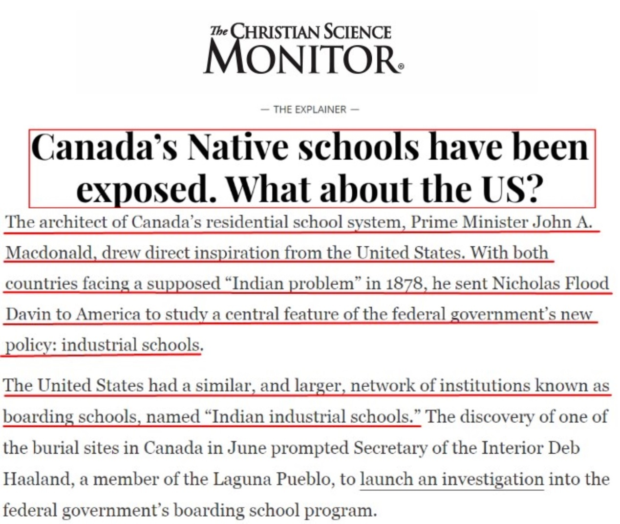 美國《基督教科學(xué)箴言報》曾發(fā)文揭露,加拿大原住民寄宿學(xué)校系統(tǒng)的所謂“靈感”本就來自美國。從1819年的所謂“印第安人文明開化法案”開始,美國便實施了一系列旨在“同化印第安人”的法律政策,在全國范圍設(shè)立或資助寄宿學(xué)校,強行安排印第安兒童入學(xué)。