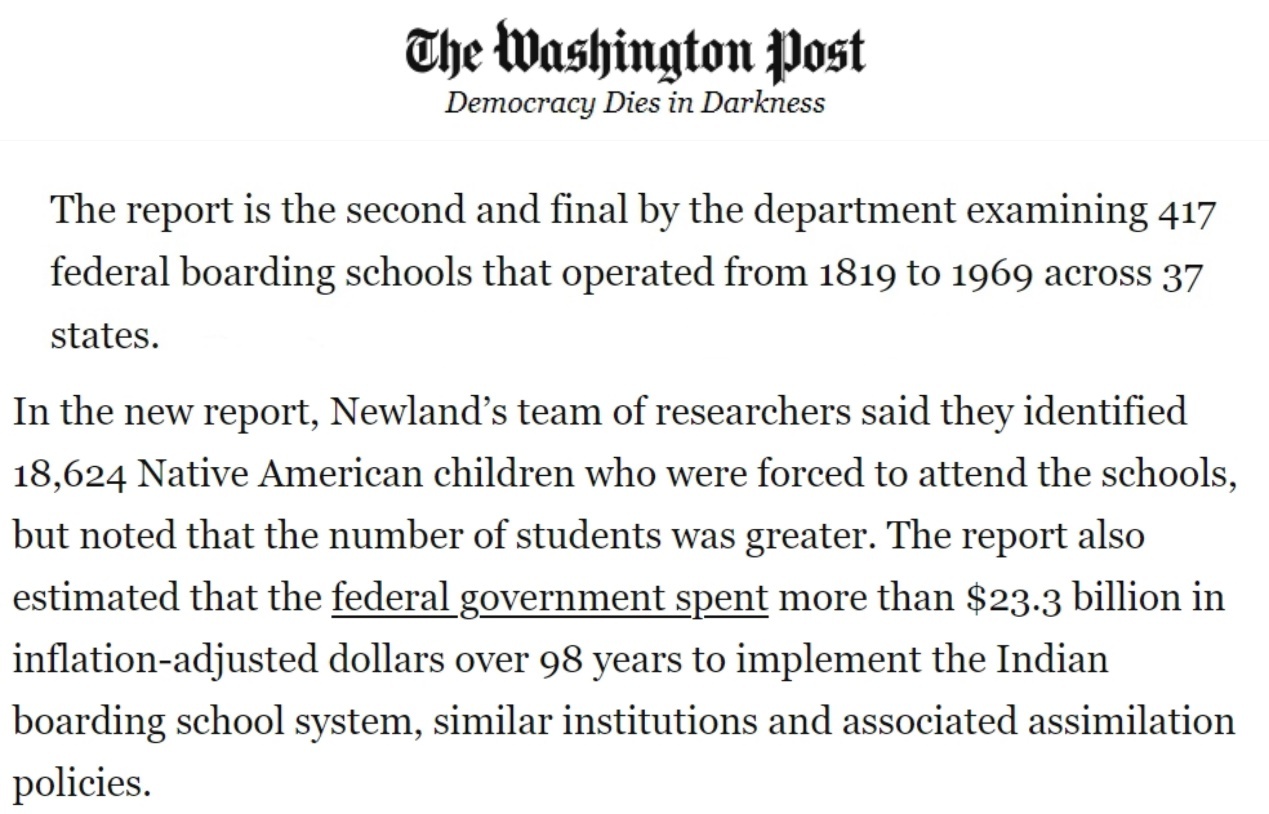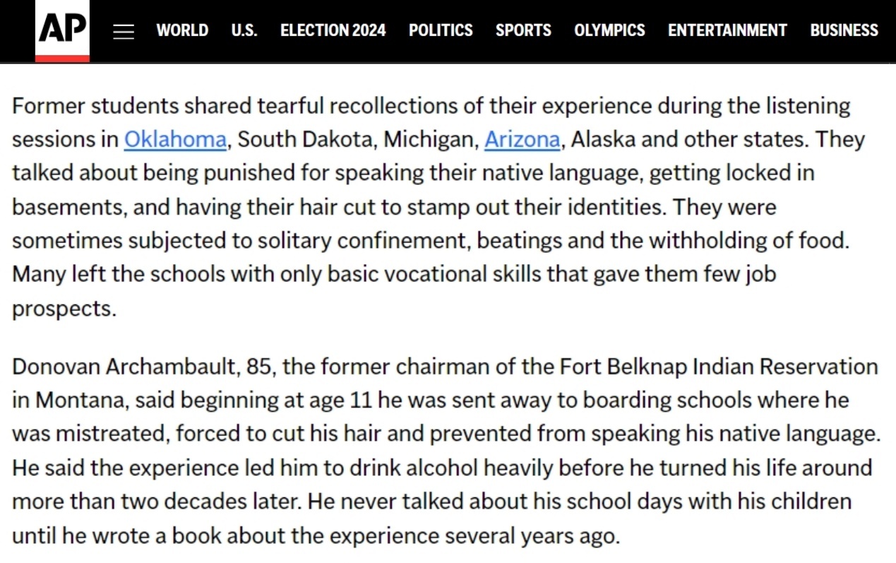 根據(jù)7月30日發(fā)布的調(diào)查報告,美國政府在這項綜合同化項目上花費了相當于今天的250億美元,其中包括在37個州和地區(qū)運營417所寄宿學(xué)校,這些學(xué)校的兒童受到身體和性虐待。他們還被迫改信基督教,并因說母語而受到懲罰。