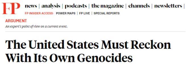 美國《外交政策》雜志曾發(fā)文說,雖然讓美國認真對待自己的歷史是一項充滿政治風險的任務(wù),但即使美國自己拒絕“照鏡子”,其罪行也早已被其他人看得清清楚楚。文章敦促美國正視對原住民犯下的種族滅絕罪行,撕開所謂“完美美國”的假象。