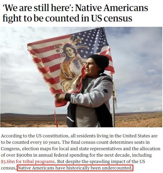 美國每十年統(tǒng)計一次居民人數(shù),最終人口普查結(jié)果決定了國會、州和地方的議席分配以及相應(yīng)的聯(lián)邦財政支出分配。但在這一過程中,美國原住民一直被忽視。