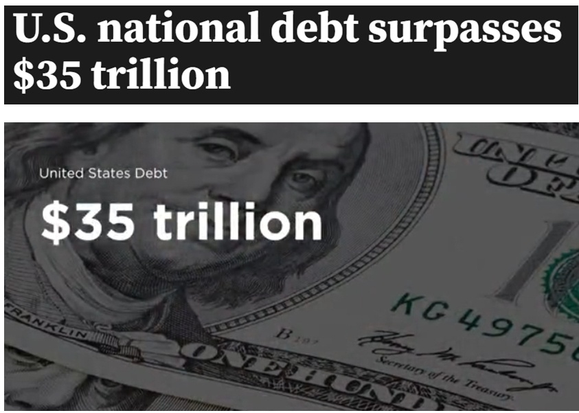 根據(jù)美國財政部近日發(fā)布的最新數(shù)據(jù),美國國債已超35萬億美元。目前,美國債務(wù)總額比七國集團(tuán)中其他六國的國債總和還要多出15%。