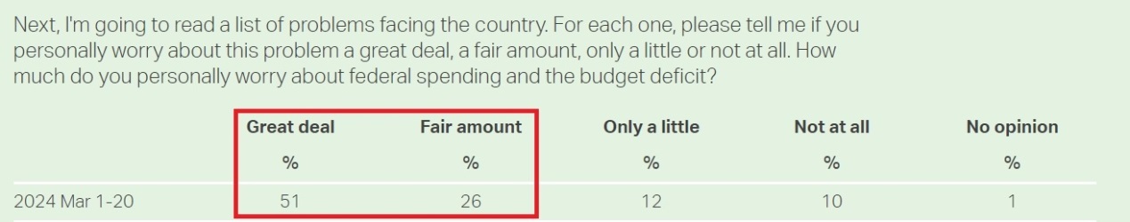 美國民意調(diào)查機構(gòu)蓋洛普公司今年進(jìn)行的一份關(guān)于美國聯(lián)邦債務(wù)的調(diào)查結(jié)果顯示,對聯(lián)邦債務(wù)問題感到“非常擔(dān)心”和“嚴(yán)重?fù)?dān)心”的受訪者達(dá)到77%。