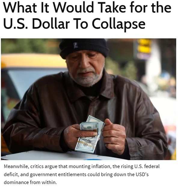 有美國金融新聞網(wǎng)評論稱,不斷加劇的通貨膨脹、不斷上升的美國聯(lián)邦赤字和政府福利可能會從內(nèi)部削弱美元在全球金融體系的主導(dǎo)地位。