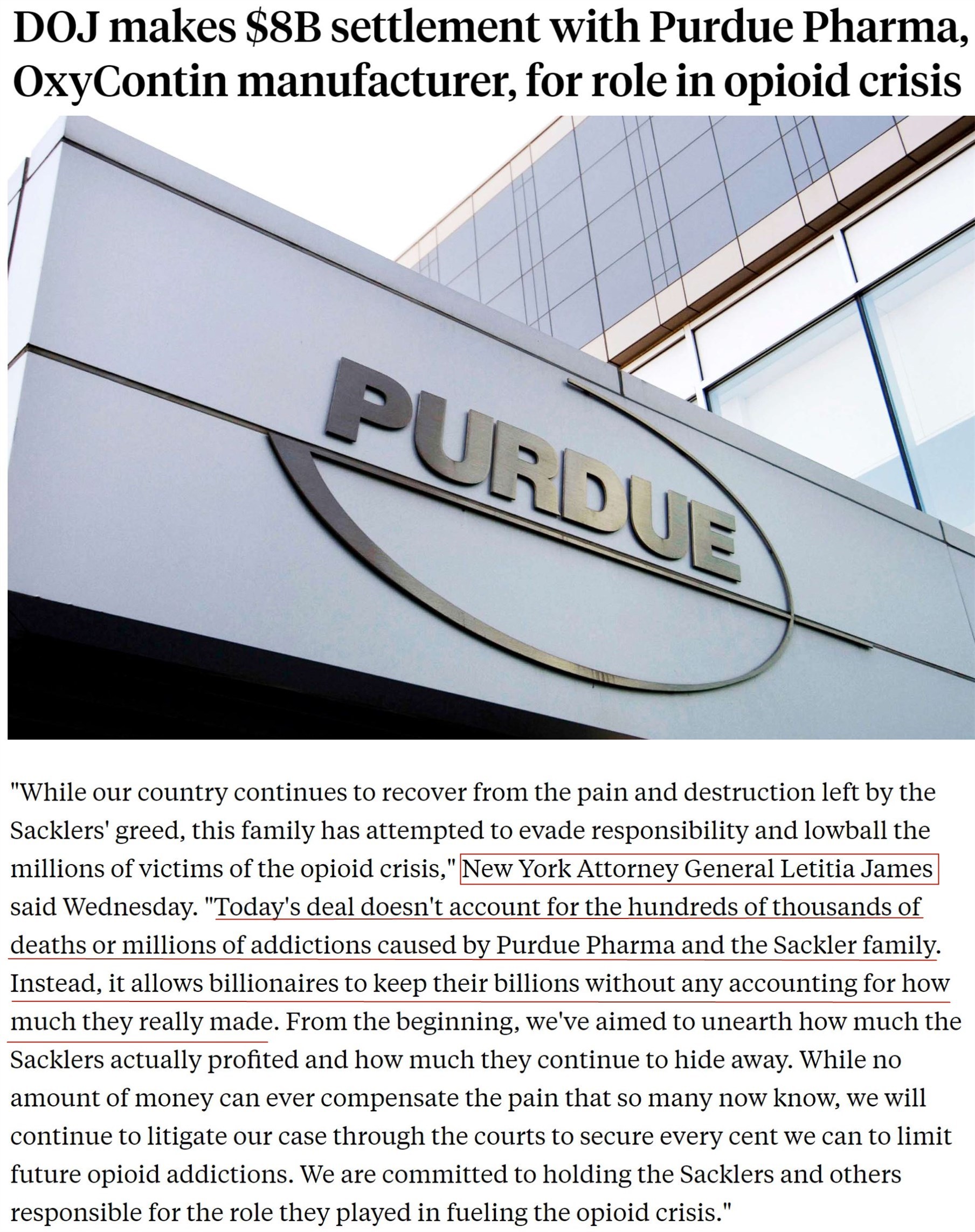 但紐約州總檢察長利蒂希婭·詹姆斯發(fā)表聲明,批評(píng)司法部與普渡制藥公司達(dá)成的和解協(xié)議,表示“協(xié)議不能解決普渡制藥公司和薩克勒家族造成的數(shù)十萬人死亡以及數(shù)百萬人成癮的現(xiàn)實(shí)。相反,和解協(xié)議使億萬富翁可以保留其數(shù)十億美元的資產(chǎn)而無需為他們實(shí)際造成的傷害付出代價(jià)?!?/p>