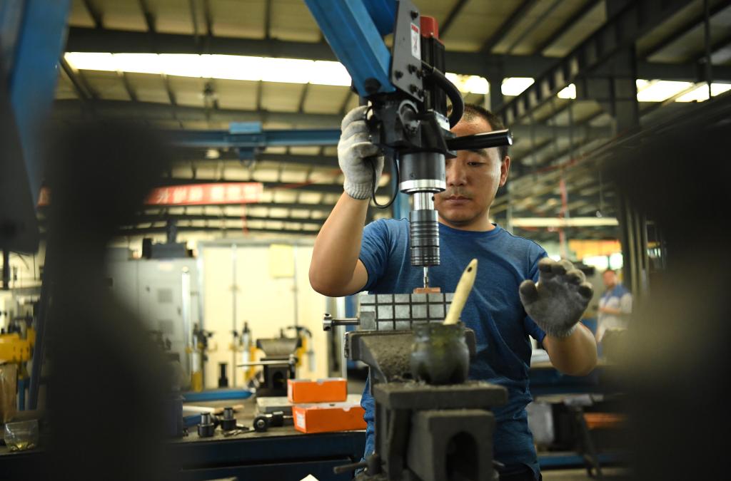 2024年7月30日,在長春吉林通用機(jī)械(集團(tuán))有限責(zé)任公司模具裝配生產(chǎn)線,鉗工在進(jìn)行攻絲操作。近年來,吉林通用機(jī)械(集團(tuán))有限責(zé)任公司通過數(shù)字化改造、智能化升級(jí)提高生產(chǎn)效率,提升產(chǎn)業(yè)競爭力,已成為全球鋁加工汽車輕量化零部件知名供應(yīng)商,為奧迪、大眾、寶馬、奔馳、保時(shí)捷等多家品牌主機(jī)廠供應(yīng)零件。新華社記者柳文惠攝