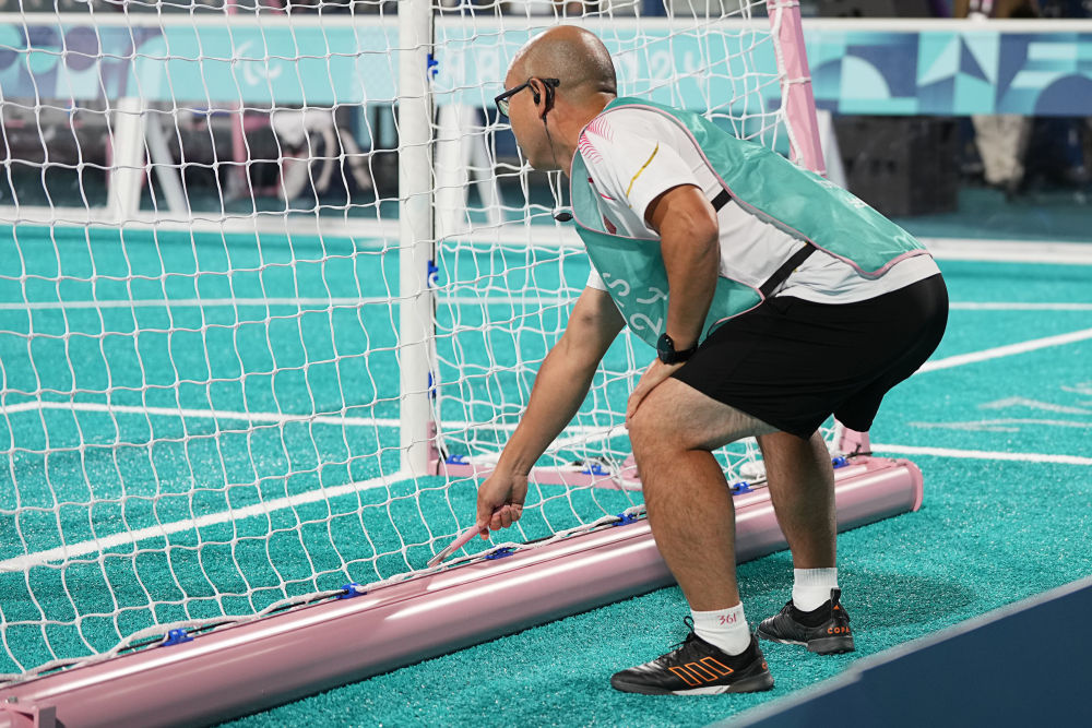 9月1日,中國隊引導(dǎo)員李進在比賽中用金屬棒敲擊門框幫助球員定位。新華社記者 熊琦 攝