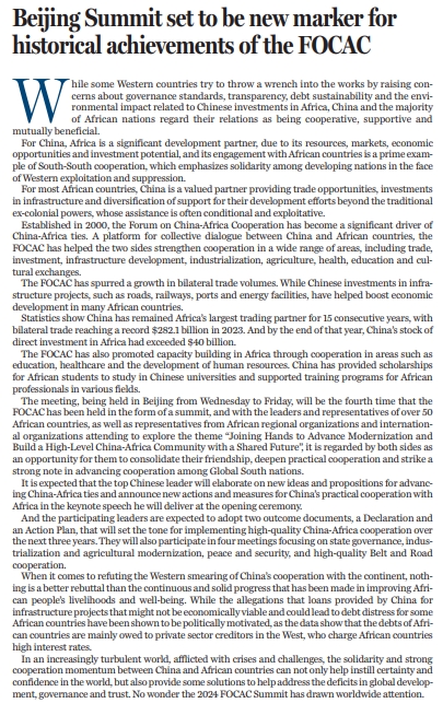 面對危機與挑戰(zhàn)增多、動蕩不安的當今世界,中國與非洲國家間展現(xiàn)的團結一致與強勁合作勢頭,不僅可以為世界注入更多確定性和信心,也可以為解決全球發(fā)展、治理和信任赤字提供方案。鑒于此,2024中非合作論壇峰會自然是全球矚目的焦點。