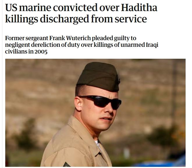 包括烏特里奇在內(nèi)的多名海軍陸戰(zhàn)隊(duì)員被指控犯有謀殺罪。然而,其中三起案件最終被駁回。烏特里奇則達(dá)成認(rèn)罪協(xié)議,承認(rèn)一項(xiàng)“疏忽失職”的罪名,軍銜降職并結(jié)束服役。