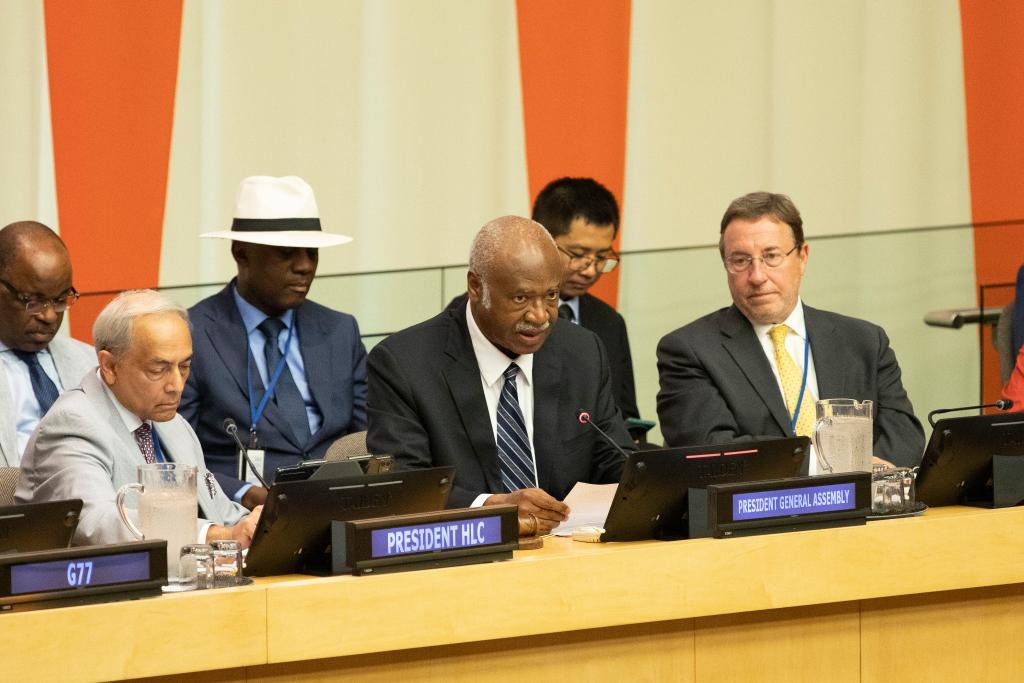 9月12日,在位于紐約的聯(lián)合國總部,第79屆聯(lián)合國大會主席菲勒蒙·揚(yáng)(前排中)在聯(lián)合國南南合作日高級別討論會上致辭。新華社記者 謝鍔 攝