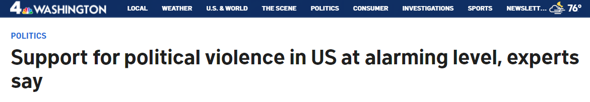 另外,美國國家廣播公司華盛頓地方頻道(NBC Washington)日前報道稱,盡管美國支持政治暴力的人與去年相比略有減少,但暴力支持者現(xiàn)在更傾向使用槍支來實現(xiàn)他們的目的。數(shù)月來,專家們始終表示,美國對出于政治動機的暴力的支持度達到了令人十分擔憂的水平。