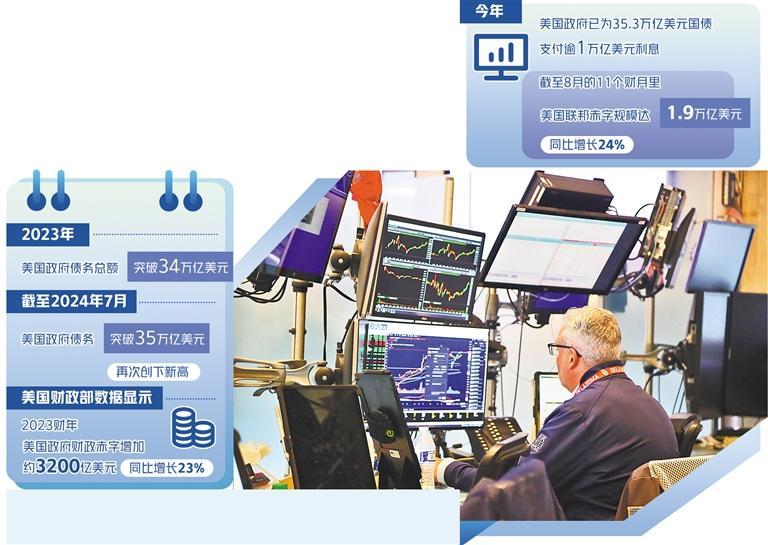 美國財政部9月12日發(fā)布的月度聯(lián)邦政府收支報告顯示,今年美國政府已為35.3萬億美元國債支付逾1萬億美元利息。償債成本上升也與美國8月財政赤字大幅上升相吻合。截至8月的前11個財月里,美國聯(lián)邦赤字規(guī)模達1.9萬億美元,同比增長24%。美國財政赤字曾在2020財年達到3.13萬億美元的峰值,此后兩年雖呈下降趨勢,但在2023財年又有所上漲:美國財政部數(shù)據(jù)顯示,2023財年美國政府的財政赤字增加了約3200億美元,同比增長23%。一方面,經(jīng)濟的衰退和各種減稅法案的實施導致財政收入減少;另一方面,為刺激經(jīng)濟增長,財政支出又不斷增加,這就導致財政赤字不斷攀升,只有通過發(fā)債彌補財政赤字,形成惡性循環(huán)。
