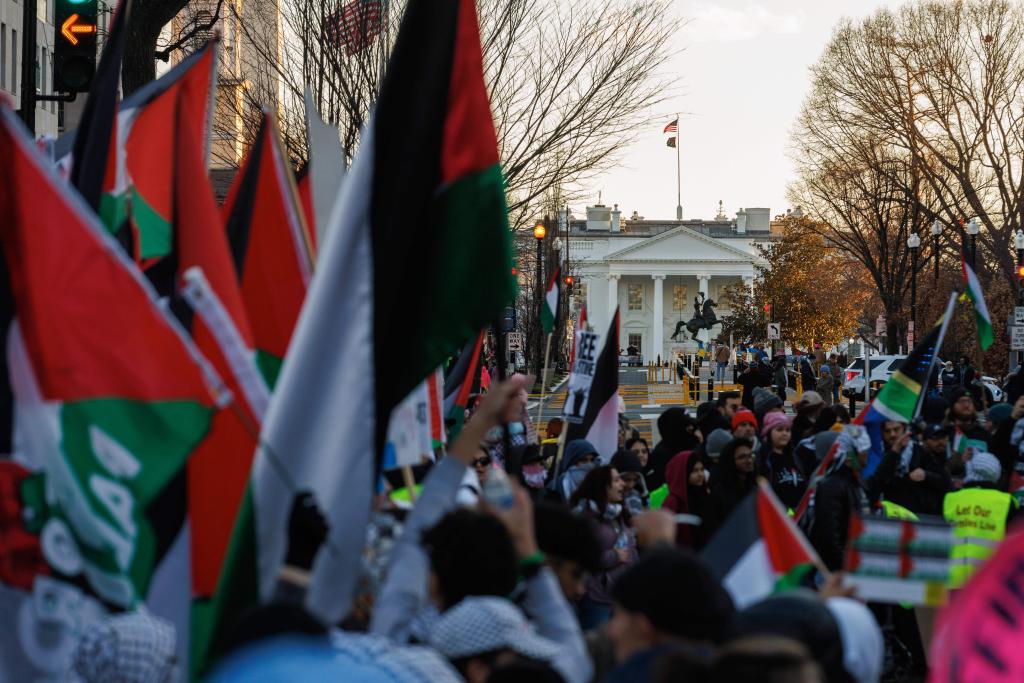 1月13日,在美國首都華盛頓,人們參加聲援巴勒斯坦的集會游行活動。大批示威者揮舞旗幟和標語,高喊口號聲援巴勒斯坦,呼吁停火。新華社發(fā)(亞倫攝)