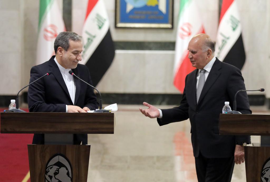 10月13日,伊拉克外長侯賽因(右)同到訪的伊朗外長阿拉格齊在首都巴格達(dá)舉行會(huì)談后參加聯(lián)合記者會(huì)。新華社發(fā)(哈利勒·達(dá)伍德攝)