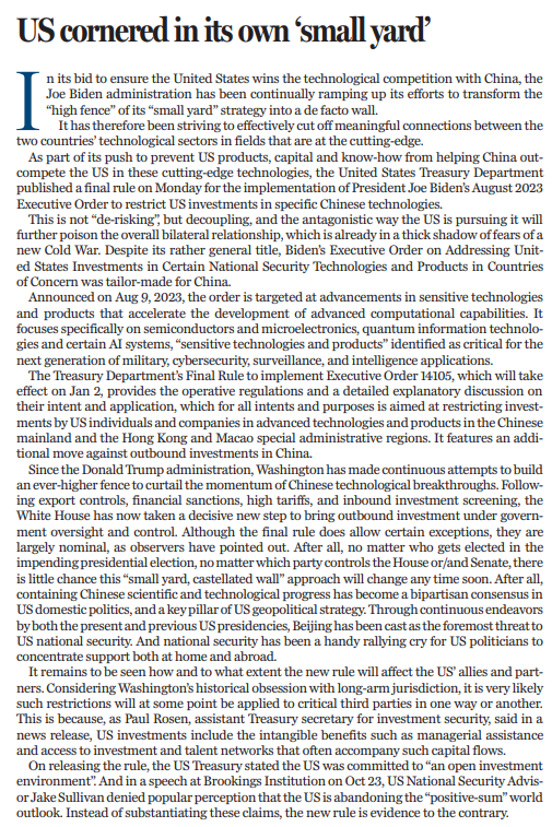 此前,外界普遍認(rèn)為美國(guó)正在放棄“正和”的世界觀。10月23日,美國(guó)總統(tǒng)國(guó)家安全事務(wù)助理沙利文在布魯金斯學(xué)會(huì)上發(fā)言時(shí)否認(rèn)了這一說法。隨后,美國(guó)財(cái)政部在發(fā)布最終規(guī)則時(shí)也表示,美國(guó)致力于建設(shè)“開放的投資環(huán)境”。然而,最終規(guī)則的發(fā)布,終究讓美國(guó)的“言”與“行”背道而馳。