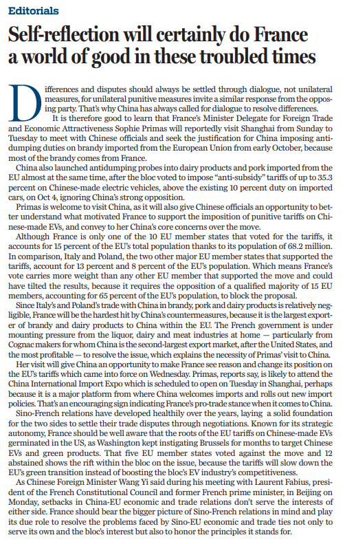 多年來,中法關(guān)系健康發(fā)展,為雙方通過談判解決貿(mào)易爭端奠定了堅(jiān)實(shí)基礎(chǔ)。以戰(zhàn)略自主著稱的法國應(yīng)該看到,幾個月以來,美國政府不斷煽動歐盟委員會對中國電動汽車和綠色產(chǎn)品采取行動,歐盟向中國電動汽車加征關(guān)稅的風(fēng)波也由此開始。加征關(guān)稅非但不能壯大歐盟電動汽車的競爭力,還會減緩其綠色轉(zhuǎn)型。表決過程中,5個成員國投票反對,12個成員國棄權(quán),也說明在對中國電動汽車加征關(guān)稅的問題上,歐盟內(nèi)部存在著分歧。