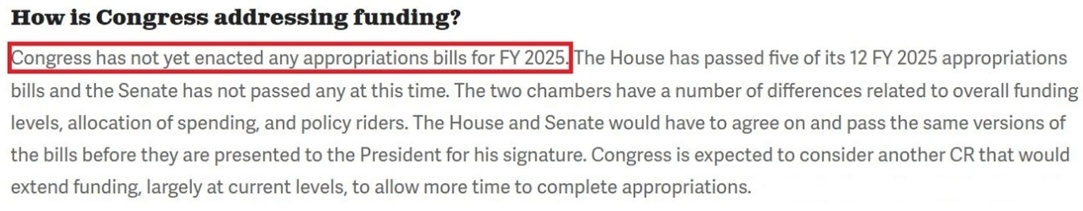 和以往一樣,白宮今年3月提出的2025財(cái)年預(yù)算案包含需要由國會中不同撥款委員會審批、分別為政府各機(jī)構(gòu)提供資金的12項(xiàng)撥款計(jì)劃,但這些年度撥款計(jì)劃迄今無一被國會通過。