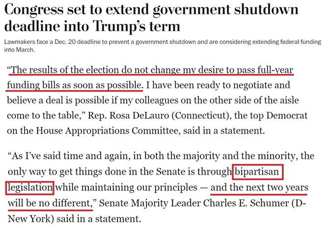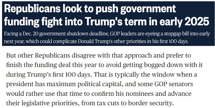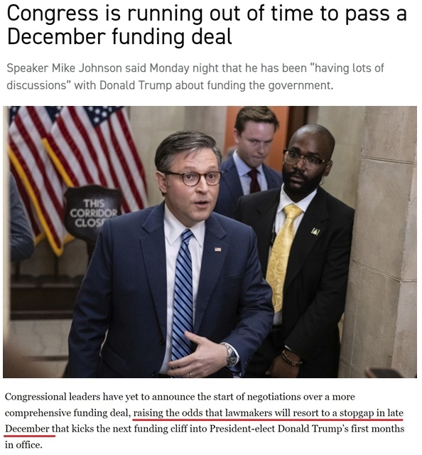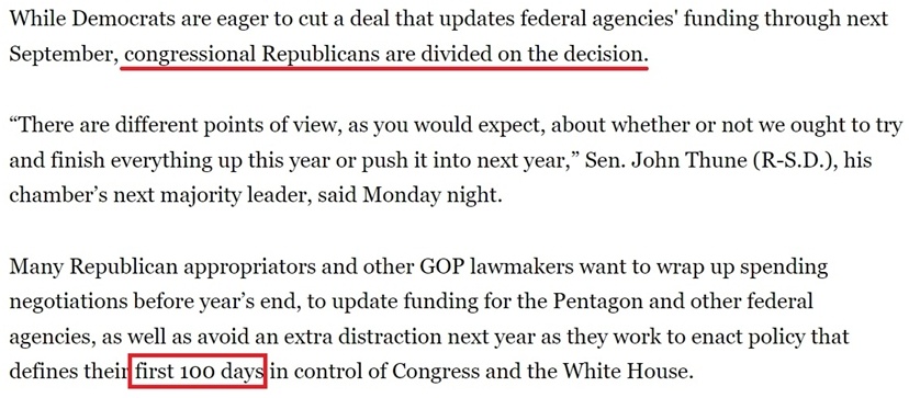 據(jù)報(bào)道,不少共和黨議員、特別是負(fù)責(zé)撥款的議員希望在年底前完成新財(cái)年的總預(yù)算支出談判,避免給特朗普的新政府明年上任后制定政策時帶來額外干擾,因?yàn)檫@些政策將“決定他們控制國會和白宮的頭100天”。