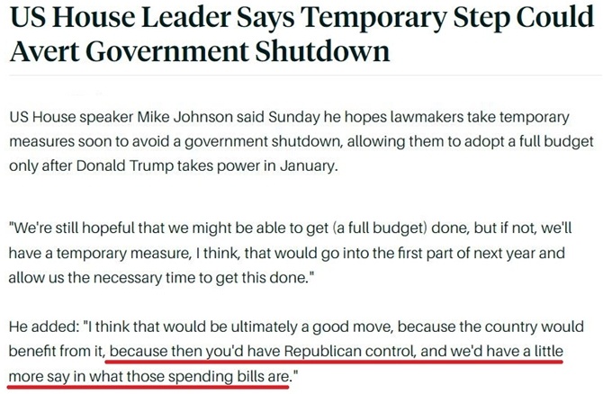 根據(jù)約翰遜的想法,國會應(yīng)通過一個“能生效至明年上半年”的短期撥款法案,以確保特朗普明年1月就任總統(tǒng)后,共和黨人能有充足的時間來按照自己的政策意愿通過完整的年度預(yù)算案。