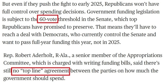 2024財(cái)年預(yù)算案就曾在驚險異常的兩黨爭斗甚至共和黨內(nèi)斗中像擠牙膏一樣折騰了整整一年時間才消?!,F(xiàn)在又輪到了早從10月就開始的2025財(cái)年的預(yù)算問題。