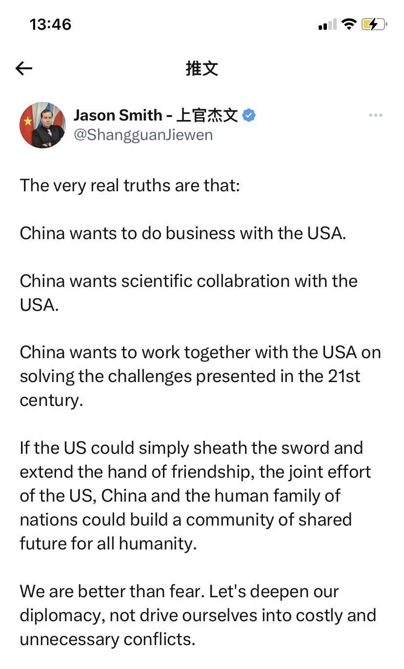 他在推特中稱,“真正的事實(shí)是,中國愿意與美國做買賣、進(jìn)行科學(xué)合作,并共同解決21世紀(jì)面臨的挑戰(zhàn)。如果美國能夠停止敵對行動,并伸出友誼之手,中美兩國和全人類大家庭可以共同努力構(gòu)建人類命運(yùn)共同體。我們比恐懼更強(qiáng)大,讓我們深化外交關(guān)系,避免陷入代價(jià)高昂且不必要的沖突中?!?/p>