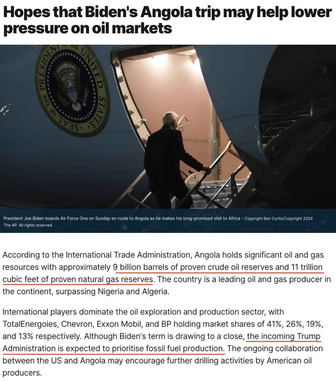 雖然拜登的任期即將結(jié)束,但預(yù)計(jì)即將上任的特朗普政府將優(yōu)先考慮化石燃料生產(chǎn)。美國(guó)和安哥拉之間正在進(jìn)行的合作可能會(huì)鼓勵(lì)美國(guó)石油生產(chǎn)商進(jìn)一步開展鉆探活動(dòng)。