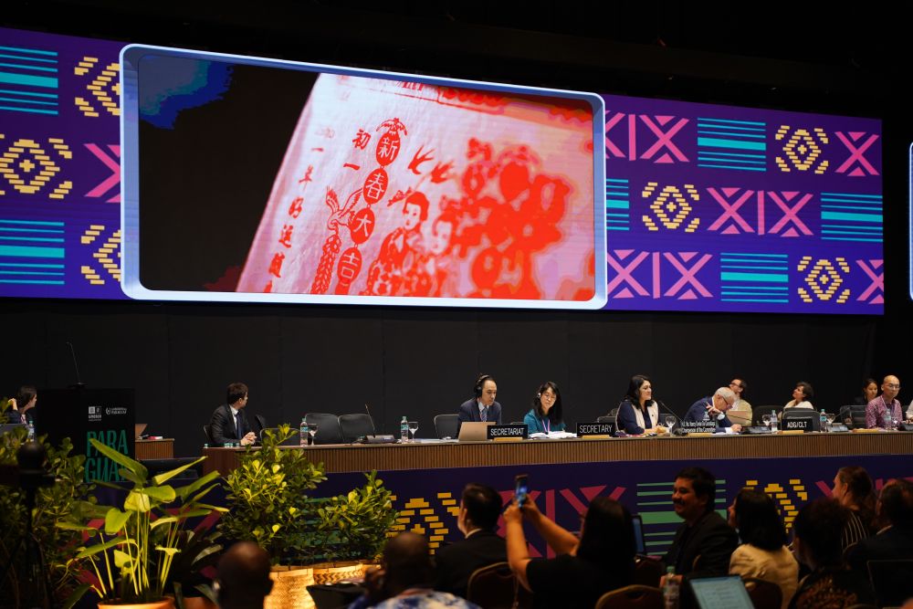 12月4日,在巴拉圭亞松森聯(lián)合國(guó)教科文組織保護(hù)非物質(zhì)文化遺產(chǎn)政府間委員會(huì)第19屆常會(huì)評(píng)審現(xiàn)場(chǎng),大屏幕播放春節(jié)宣傳視頻。新華社記者朱雨博攝