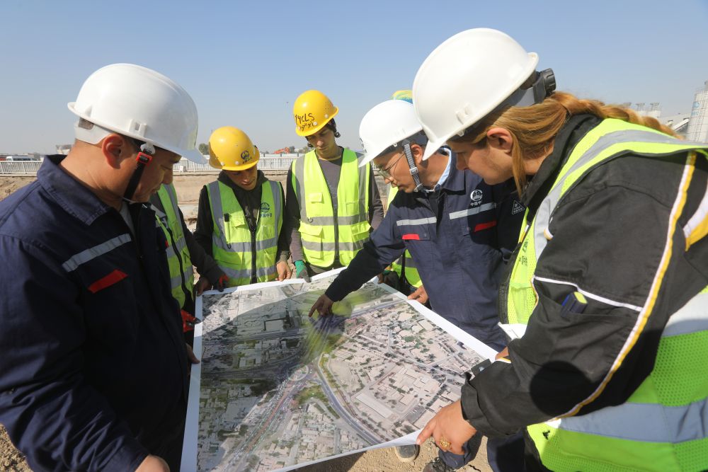 2024年3月2日,中伊員工在伊拉克巴格達(dá)尼蘇爾立體交通樞紐項目現(xiàn)場討論施工進(jìn)展。新華社發(fā)(哈利勒·達(dá)伍德攝)