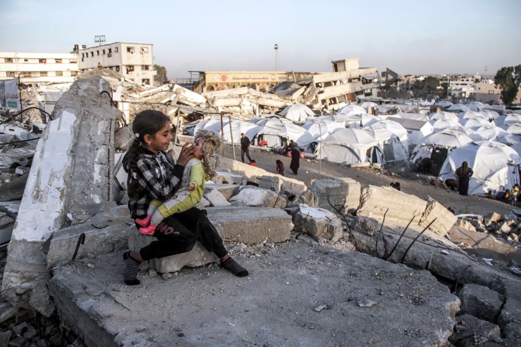 12月9日,在加沙地帶加沙城,一名流離失所的女孩在一處臨時帳篷區(qū)玩玩具。新華社發(fā)(馬哈茂德·扎基攝)