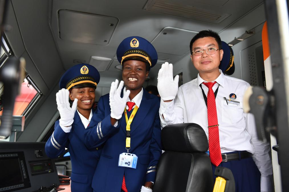 2017年5月31日,在肯尼亞蒙內(nèi)鐵路蒙巴薩西站,火車司機(jī)艾麗斯(左)、肯西莉亞(中)和旅客列車指導(dǎo)司機(jī)涂主新在蒙內(nèi)鐵路首班列車發(fā)車前揮手致意。(新華社記者孫瑞博攝)