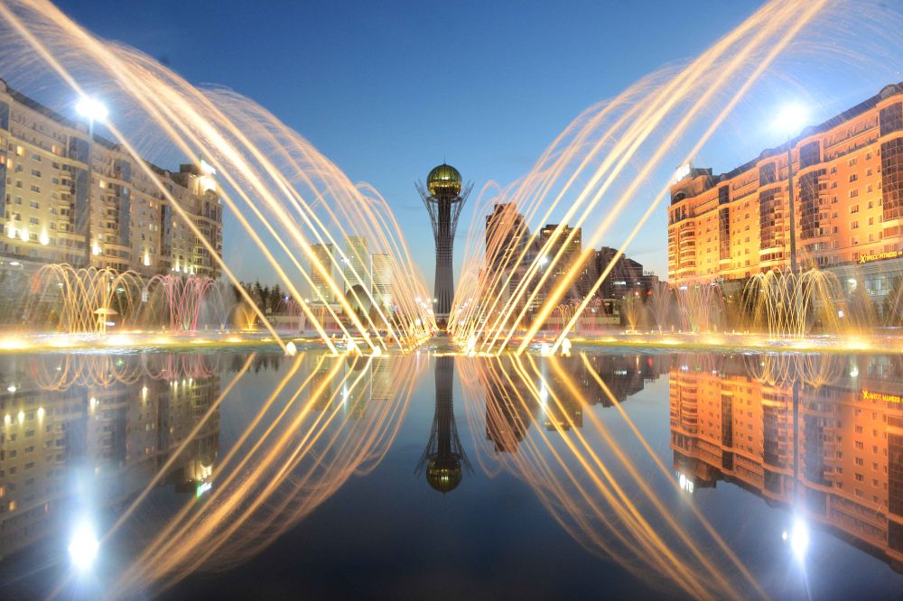 這是2017年6月11日拍攝的哈薩克斯坦首都阿斯塔納的巴伊杰列克觀景塔夜景。新華社記者沙達提攝