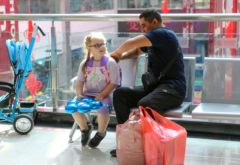 2024年7月26日,在中哈霍爾果斯國際邊境合作中心,來自哈薩克斯坦的游客在購物后休息。新華社記者林立平攝