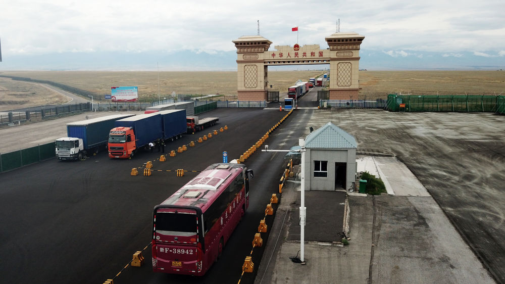 2024年7月15日,一輛國際客運班車即將駛出國門,前往哈薩克斯坦(無人機照片)。新華社記者張嘯誠攝