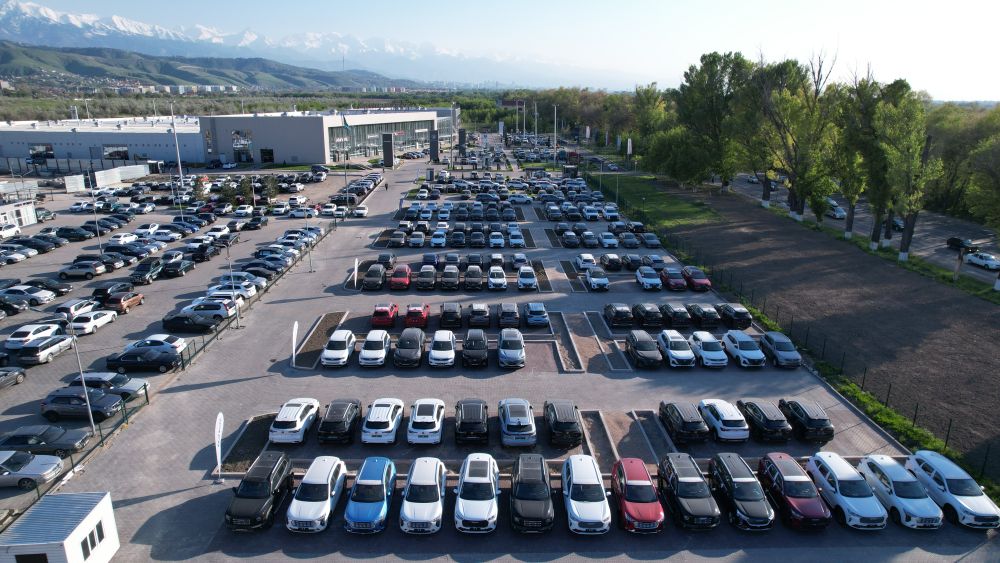 2023年5月5日,汽車停放在哈薩克斯坦阿拉木圖一家大型二手車交易市場(無人機照片)。新華社發(fā)(奧斯帕諾夫攝)