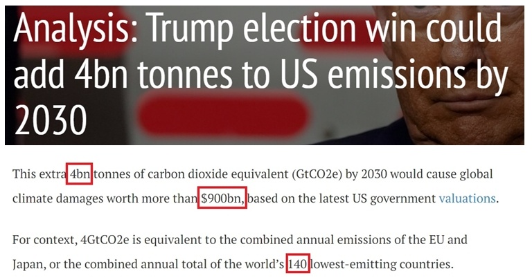 有報告指出,相對于目前水平,特朗普的再度掌權(quán)將讓美國到2030年的碳排放累計增加40億噸二氧化碳當(dāng)量,比全球排放量最少的140個國家的排放總和還要多。