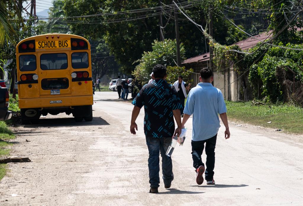 2月14日,在洪都拉斯西北部城市圣佩德羅蘇拉,兩名返鄉(xiāng)移民步行離開返鄉(xiāng)移民援助中心。新華社發(fā)(戴維 攝)